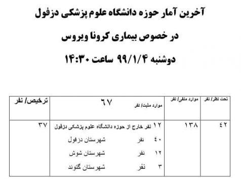 آمار جدید تا روز ۷ فروردین ۹۹: خارج از حوزه دانشگاه علوم پزشکی دزفول: ۱۳ نفر ( بدون افزایش) دزفول: ۴۹نفر ( ۳نفر افزایش ) شوش: ۱۷نفر ( بدون افزایش)