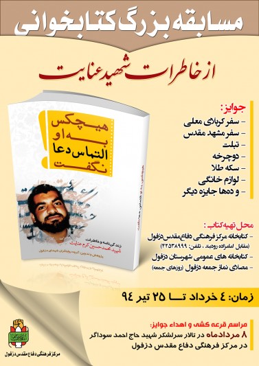 به گزارش دزمهراب مسابقه بزرگ کتابخوانی “هیچکس به او التماس دعا نگفت ” به همت گروه روایتگران شهدای دزفول و مرکز فرهنگی دفاع مقدس دزفول برگزار میگردد. عزیزانی که تمایل